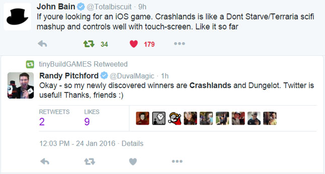 While we had brief contact with each storefront, it was never a given that any of them would listen to us or care about Crashlands’ launch. Come January 21st, each one of them gave us some form of a nod that helped visibility massively: On iTunes, this was Editor’s Choice for the iPad all over the world; on Google Play, an icon in their New Games section; and on Steam, a pop-up ad that lasted through the weekend.